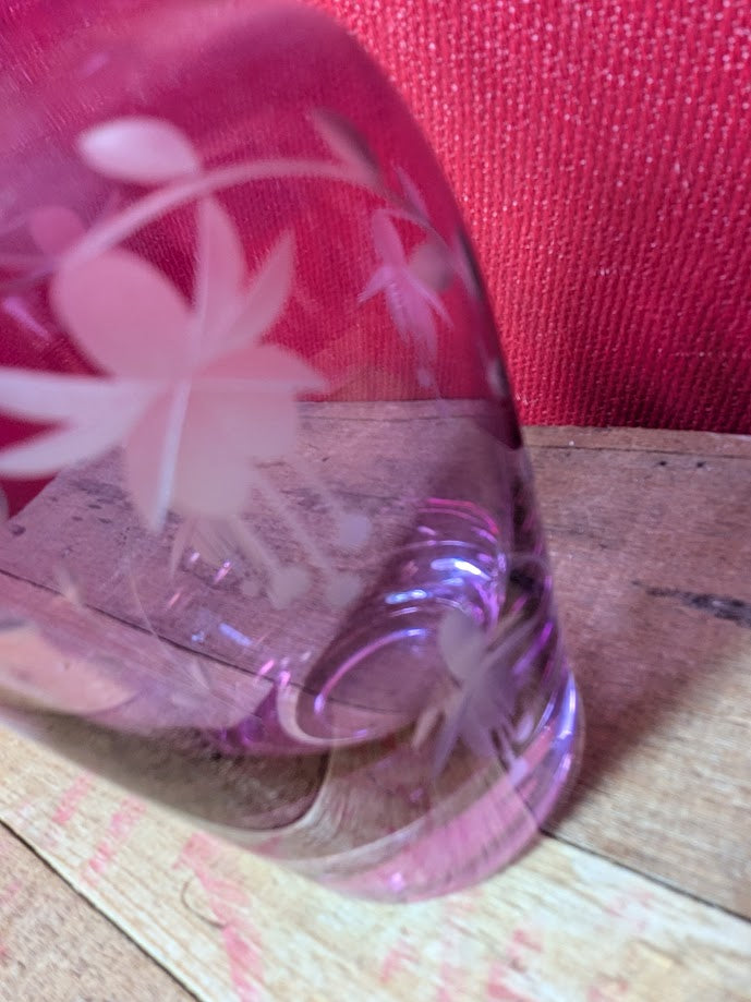Purple glass vase with hand cut flower design.