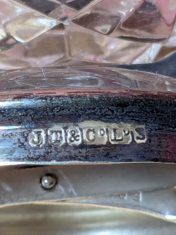 Cut glass jar with marked nickel plated lid with integrated sugar tongs.