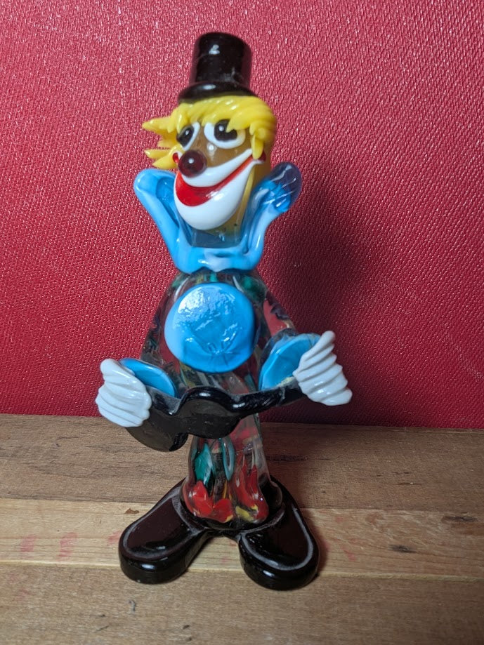 Murano glass clown with top hat and guitar.