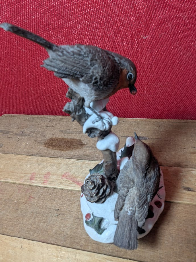 Winter Robins with snow, fir cone and berries.